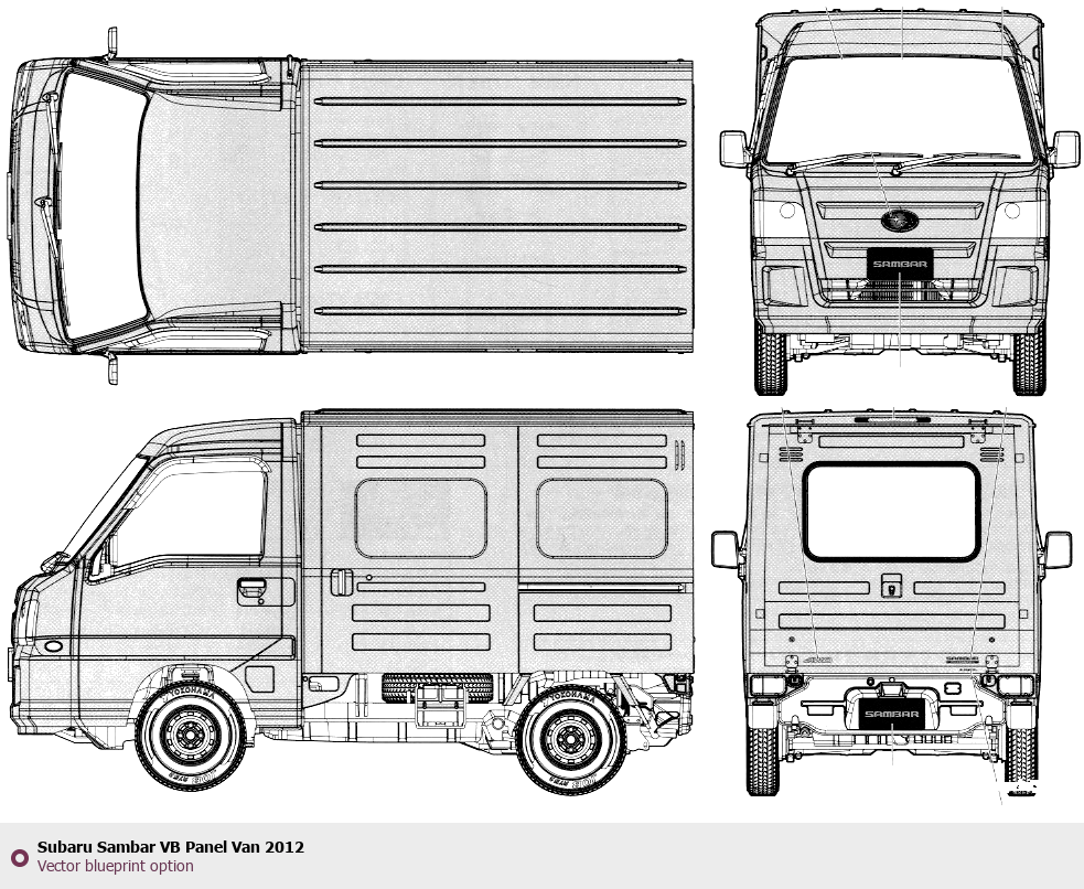 Raster blueprint of the 2012 Subaru Sambar VB Panel Van Van. This free downloadable image can be used for graphic projects, digital design, and 3D modeling. The file provides accurate exterior proportions of the vehicle. Model year: 2012. Body type: Van.