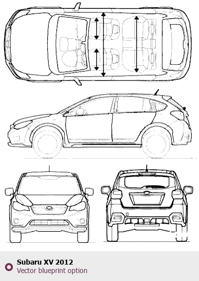 Raster blueprint of the 2012 Subaru XV SUV. This free downloadable image can be used for graphic projects, digital design, and 3D modeling. The file provides accurate exterior proportions of the vehicle. Model year: 2012. Body type: SUV.
