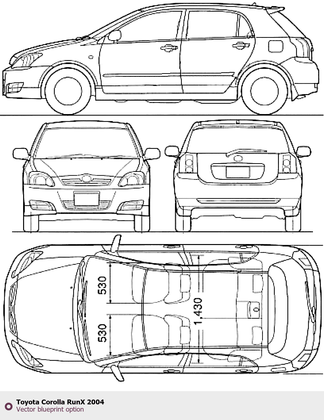 Raster blueprint of the 2004 Toyota Corolla RunX Tag. This free downloadable image can be used for graphic projects, digital design, and 3D modeling. The file provides accurate exterior proportions of the vehicle. Model year: 2004. Body type: Tag.