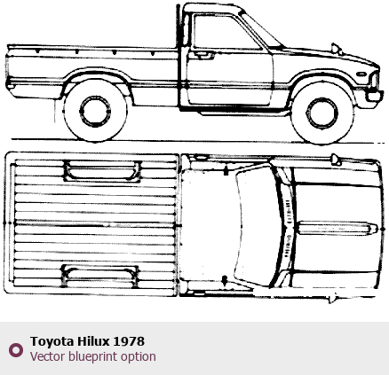Raster blueprint of the 1978 Toyota Hilux Pickup Truck. This free downloadable image can be used for graphic projects, digital design, and 3D modeling. The file provides accurate exterior proportions of the vehicle. Model year: 1978. Body type: Pickup Truck.