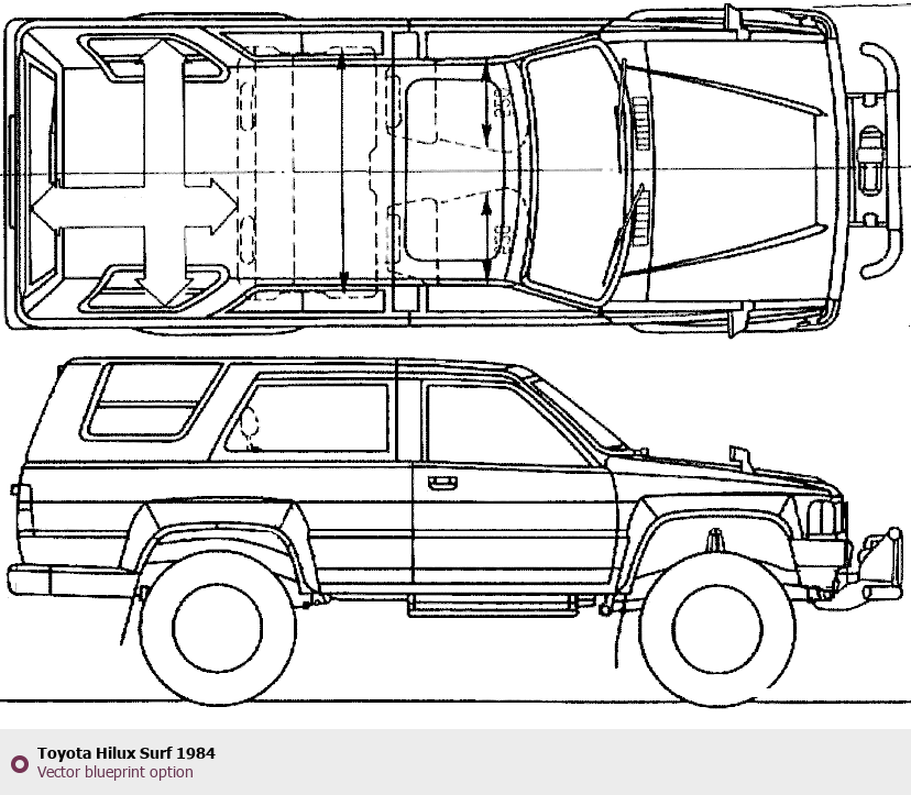 Raster blueprint of the 1984 Toyota Hilux Surf SUV. This free downloadable image can be used for graphic projects, digital design, and 3D modeling. The file provides accurate exterior proportions of the vehicle. Model year: 1984. Body type: SUV.