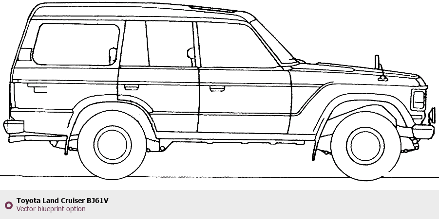 Raster blueprint of the Toyota Land Cruiser BJ61V Tag. This free downloadable image can be used for graphic projects, digital design, and 3D modeling. The file provides accurate exterior proportions of the vehicle. Body type: Tag.