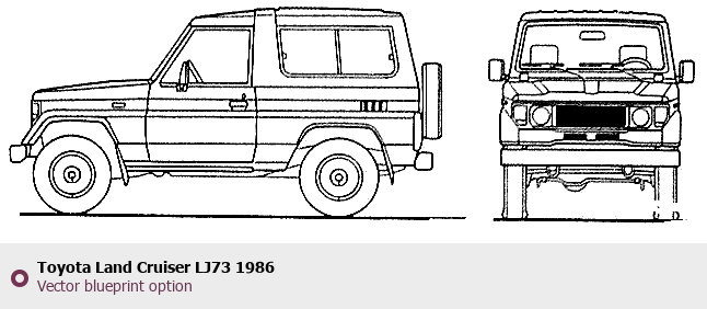 Raster blueprint of the 1986 Toyota Land Cruiser LJ73 Tag. This free downloadable image can be used for graphic projects, digital design, and 3D modeling. The file provides accurate exterior proportions of the vehicle. Model year: 1986. Body type: Tag.