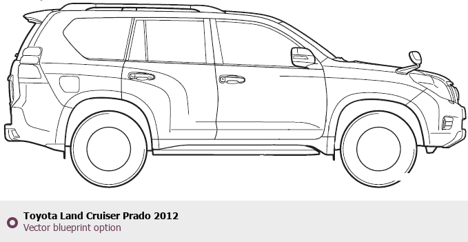Raster blueprint of the 2012 Toyota Land Cruiser Prado SUV. This free downloadable image can be used for graphic projects, digital design, and 3D modeling. The file provides accurate exterior proportions of the vehicle. Model year: 2012. Body type: SUV.