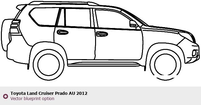 Raster blueprint of the 2012 Toyota Land Cruiser Prado AU SUV. This free downloadable image can be used for graphic projects, digital design, and 3D modeling. The file provides accurate exterior proportions of the vehicle. Model year: 2012. Body type: SUV.