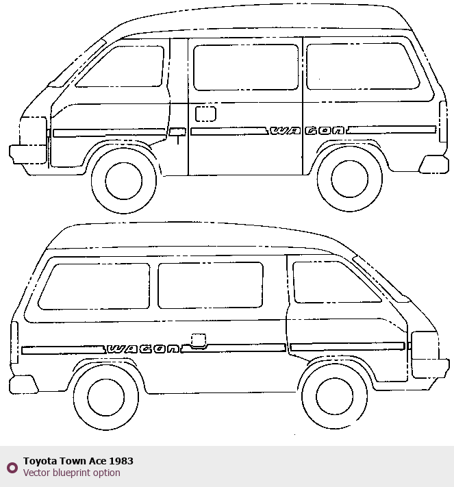 Raster blueprint of the 1983 Toyota Town Ace Tag. This free downloadable image can be used for graphic projects, digital design, and 3D modeling. The file provides accurate exterior proportions of the vehicle. Model year: 1983. Body type: Tag.