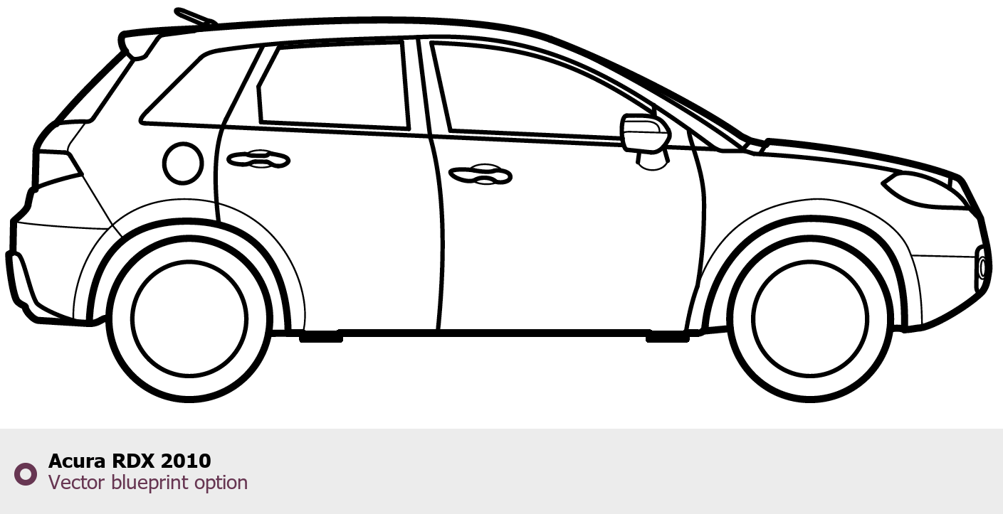 Raster blueprint of the 2010 Acura RDX SUV. This free downloadable image can be used for graphic projects, digital design, and 3D modeling. The file provides accurate exterior proportions of the vehicle. Model year: 2010. Body type: SUV.