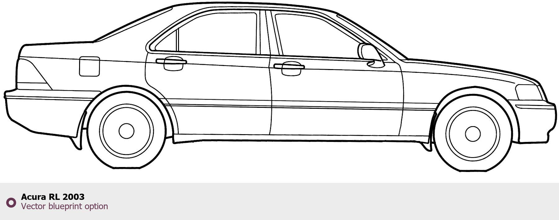 Raster blueprint of the 2003 Acura RL Sedan. This free downloadable image can be used for graphic projects, digital design, and 3D modeling. The file provides accurate exterior proportions of the vehicle. Model year: 2003. Body type: Sedan.