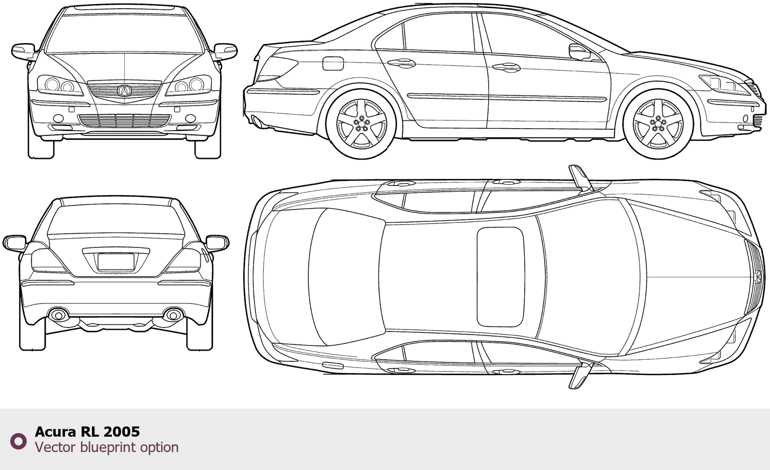 Raster blueprint of the 2005 Acura RL Sedan. This free downloadable image can be used for graphic projects, digital design, and 3D modeling. The file provides accurate exterior proportions of the vehicle. Model year: 2005. Body type: Sedan.