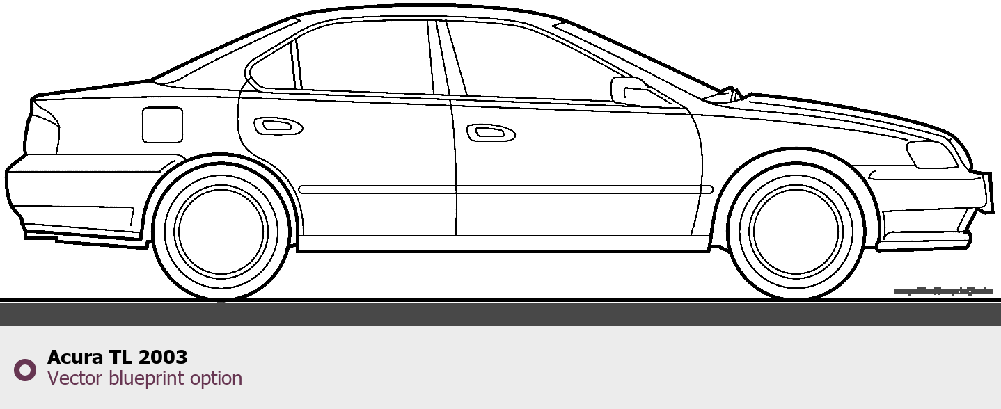 Raster blueprint of the 2003 Acura TL Sedan. This free downloadable image can be used for graphic projects, digital design, and 3D modeling. The file provides accurate exterior proportions of the vehicle. Model year: 2003. Body type: Sedan.