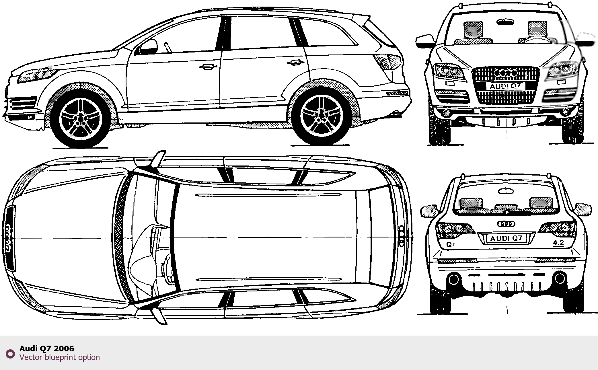 Raster blueprint of the 2006 Audi Q7 SUV. This free downloadable image can be used for graphic projects, digital design, and 3D modeling. The file provides accurate exterior proportions of the vehicle. Model year: 2006. Body type: SUV.