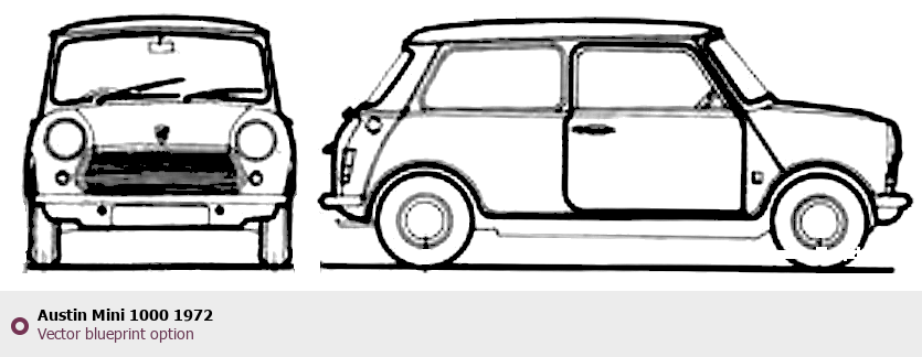 Raster blueprint of the 1972 Austin Mini 1000 Hatchback. This free downloadable image can be used for graphic projects, digital design, and 3D modeling. The file provides accurate exterior proportions of the vehicle. Model year: 1972. Body type: Hatchback.