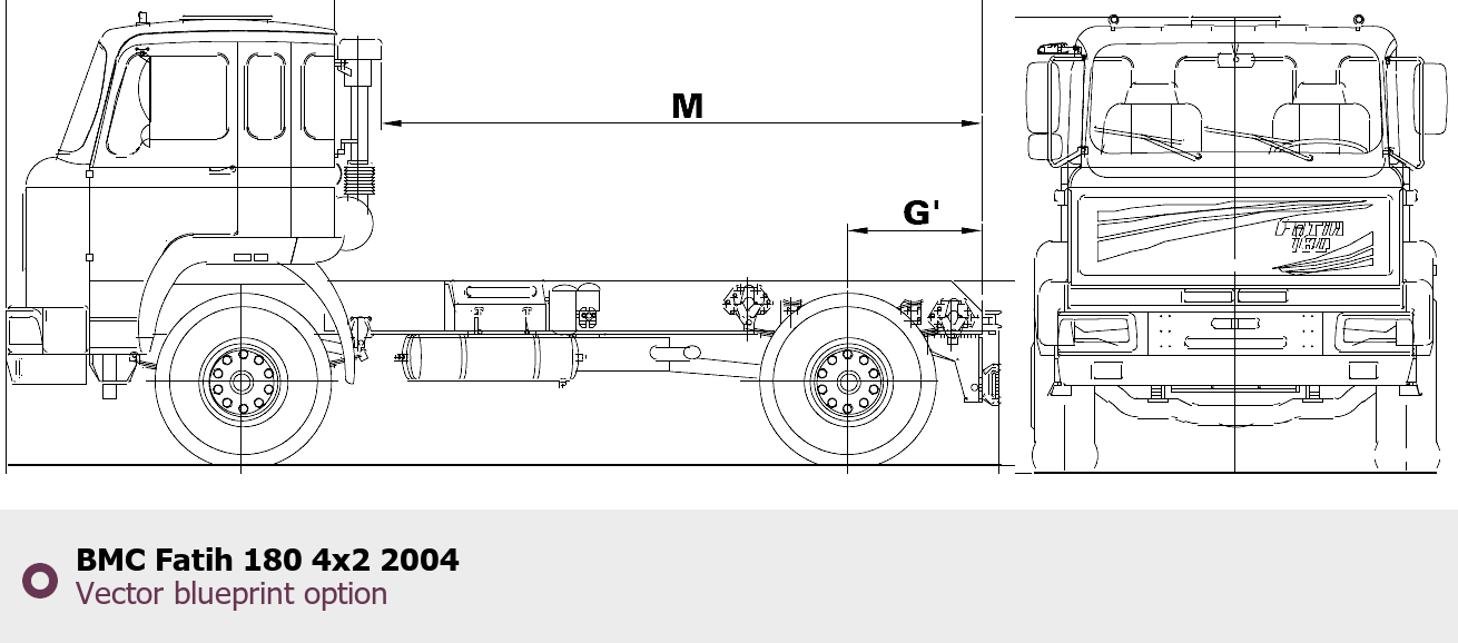 Raster blueprint of the 2004 BMC Fatih 180 4x2 Heavy Truck. This free downloadable image can be used for graphic projects, digital design, and 3D modeling. The file provides accurate exterior proportions of the vehicle. Model year: 2004. Body type: Heavy Truck.