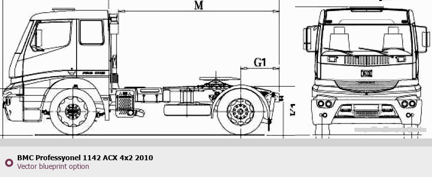 Raster blueprint of the 2010 BMC Professyonel 1142 ACX 4x2 Heavy Truck. This free downloadable image can be used for graphic projects, digital design, and 3D modeling. The file provides accurate exterior proportions of the vehicle. Model year: 2010. Body type: Heavy Truck.