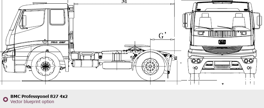 Raster blueprint of the BMC Professyonel 827 4x2 Heavy Truck. This free downloadable image can be used for graphic projects, digital design, and 3D modeling. The file provides accurate exterior proportions of the vehicle. Body type: Heavy Truck.