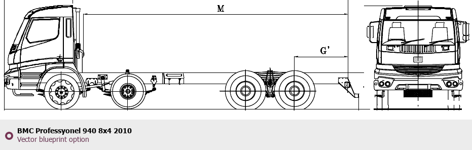 Raster blueprint of the 2010 BMC Professyonel 940 8x4 Heavy Truck. This free downloadable image can be used for graphic projects, digital design, and 3D modeling. The file provides accurate exterior proportions of the vehicle. Model year: 2010. Body type: Heavy Truck.