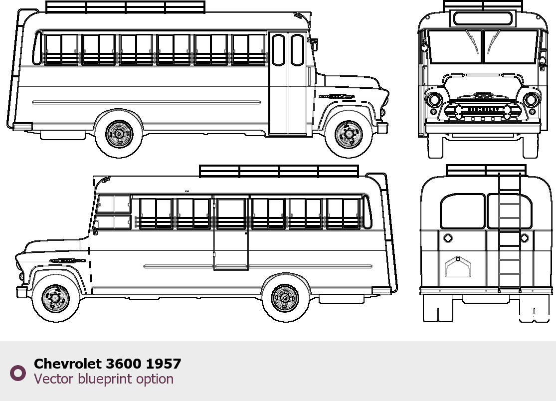 Raster blueprint of the 1957 Chevrolet 3600 Bus. This free downloadable image can be used for graphic projects, digital design, and 3D modeling. The file provides accurate exterior proportions of the vehicle. Model year: 1957. Body type: Bus.