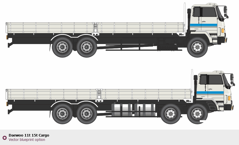 Raster blueprint of the Daewoo 11t 15t Cargo Heavy Truck. This free downloadable image can be used for graphic projects, digital design, and 3D modeling. The file provides accurate exterior proportions of the vehicle. Body type: Heavy Truck.