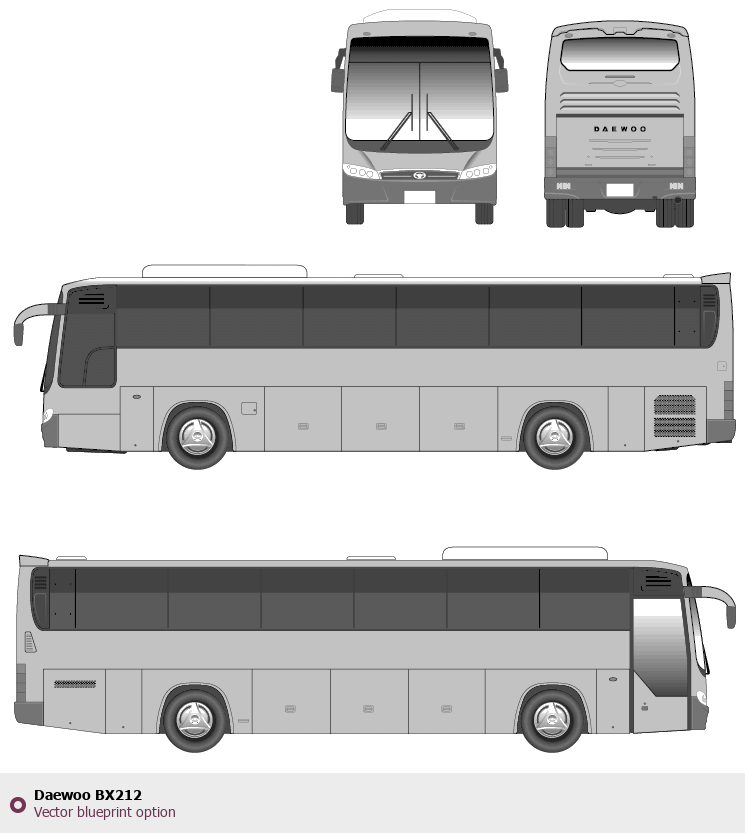 Raster blueprint of the Daewoo BX212 Bus. This free downloadable image can be used for graphic projects, digital design, and 3D modeling. The file provides accurate exterior proportions of the vehicle. Body type: Bus.