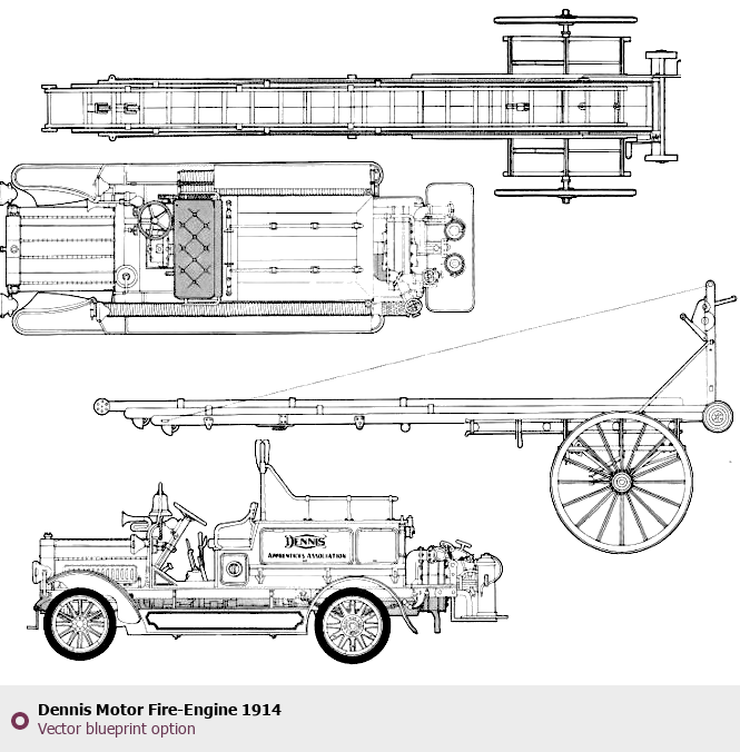 Raster blueprint of the 1914 Dennis Motor Fire-Engine Bus. This free downloadable image can be used for graphic projects, digital design, and 3D modeling. The file provides accurate exterior proportions of the vehicle. Model year: 1914. Body type: Bus.