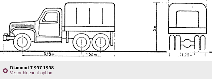 Raster blueprint of the 1958 Diamond T 957 Heavy Truck. This free downloadable image can be used for graphic projects, digital design, and 3D modeling. The file provides accurate exterior proportions of the vehicle. Model year: 1958. Body type: Heavy Truck.