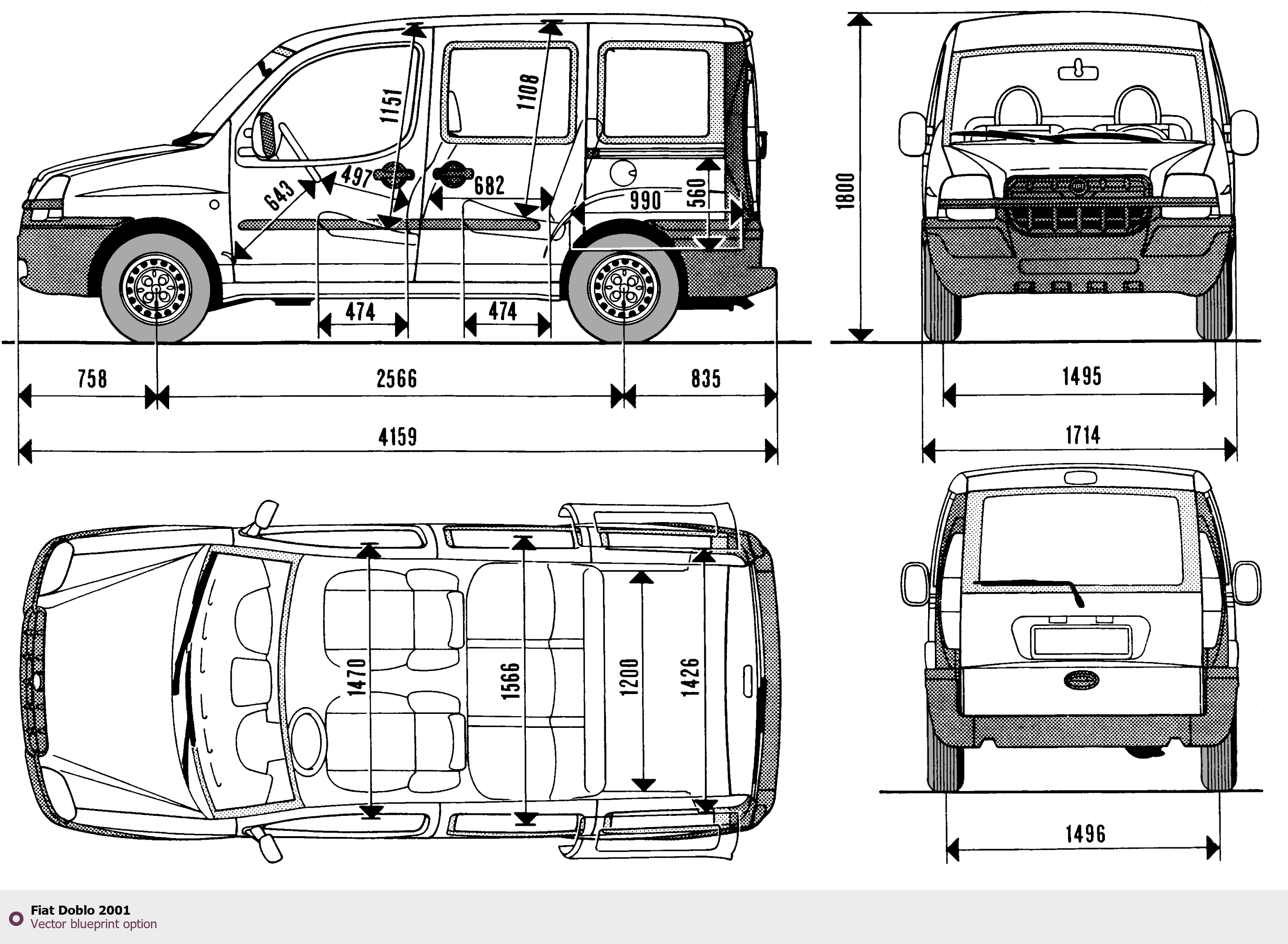 Raster blueprint of the 2001 Fiat Doblo Tag. This free downloadable image can be used for graphic projects, digital design, and 3D modeling. The file provides accurate exterior proportions of the vehicle. Model year: 2001. Body type: Tag.
