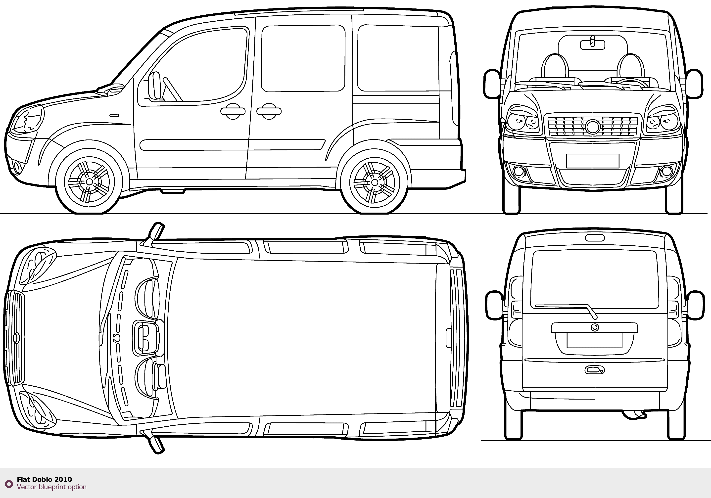 Raster blueprint of the 2010 Fiat Doblo Tag. This free downloadable image can be used for graphic projects, digital design, and 3D modeling. The file provides accurate exterior proportions of the vehicle. Model year: 2010. Body type: Tag.