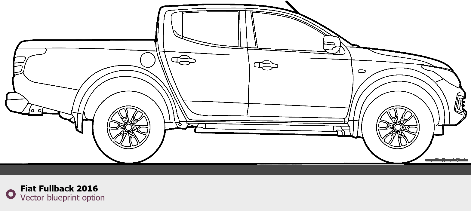 Raster blueprint of the 2016 Fiat Fullback Pickup Truck. This free downloadable image can be used for graphic projects, digital design, and 3D modeling. The file provides accurate exterior proportions of the vehicle. Model year: 2016. Body type: Pickup Truck.