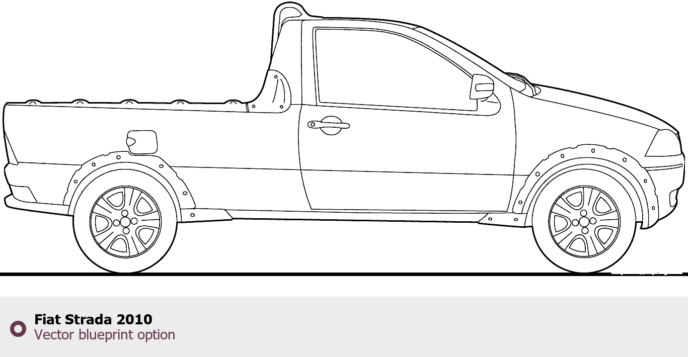 Raster blueprint of the 2010 Fiat Strada Pickup Truck. This free downloadable image can be used for graphic projects, digital design, and 3D modeling. The file provides accurate exterior proportions of the vehicle. Model year: 2010. Body type: Pickup Truck.