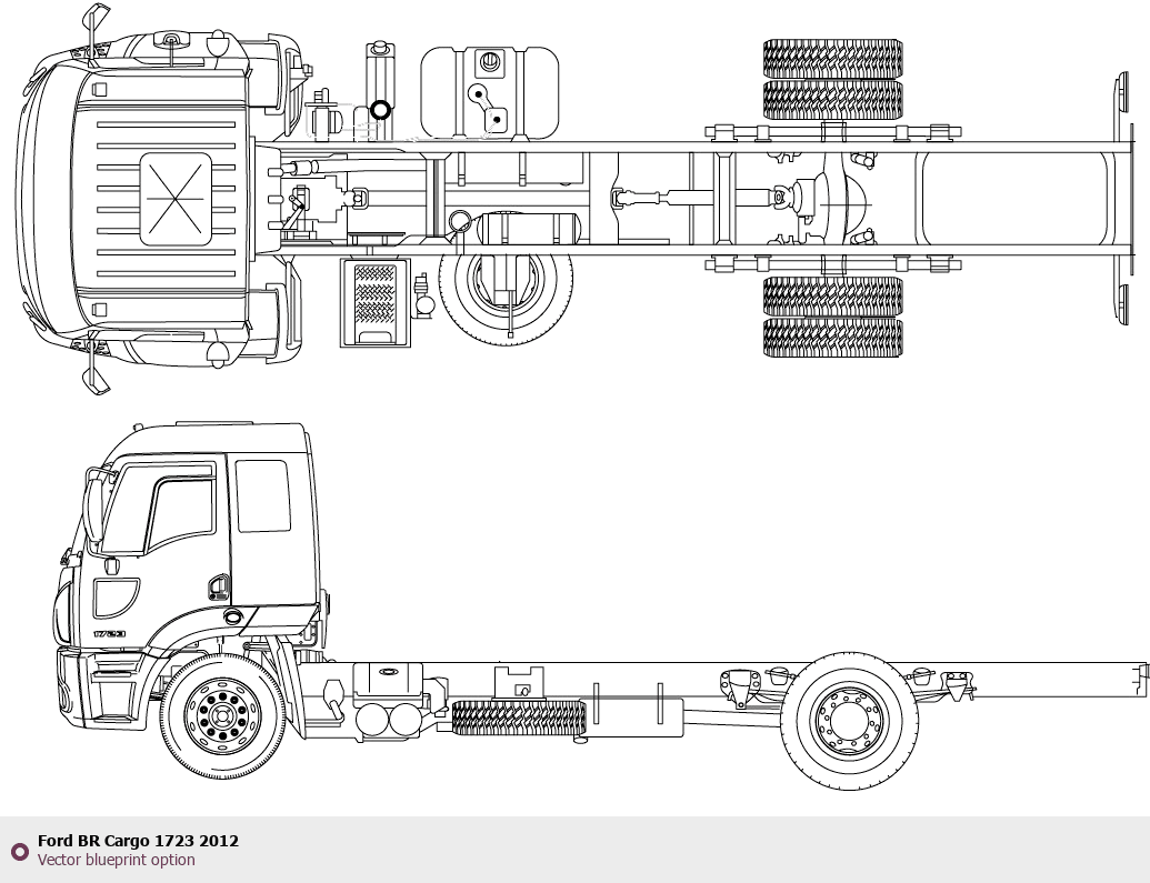 Raster blueprint of the 2012 Ford BR Cargo 1723 Heavy Truck. This free downloadable image can be used for graphic projects, digital design, and 3D modeling. The file provides accurate exterior proportions of the vehicle. Model year: 2012. Body type: Heavy Truck.