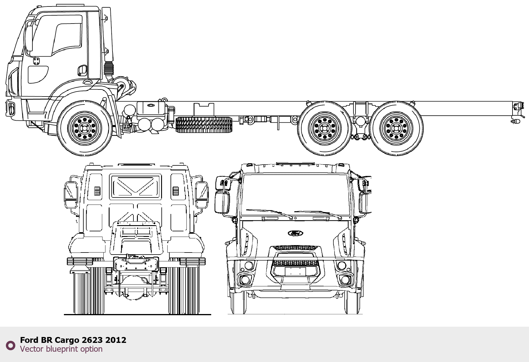 Raster blueprint of the 2012 Ford BR Cargo 2623 Heavy Truck. This free downloadable image can be used for graphic projects, digital design, and 3D modeling. The file provides accurate exterior proportions of the vehicle. Model year: 2012. Body type: Heavy Truck.