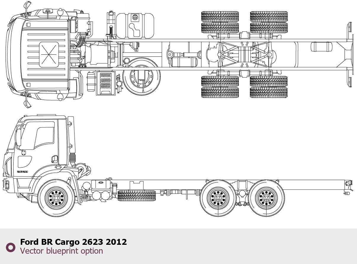 Raster blueprint of the 2012 Ford BR Cargo 2623 Heavy Truck. This free downloadable image can be used for graphic projects, digital design, and 3D modeling. The file provides accurate exterior proportions of the vehicle. Model year: 2012. Body type: Heavy Truck.