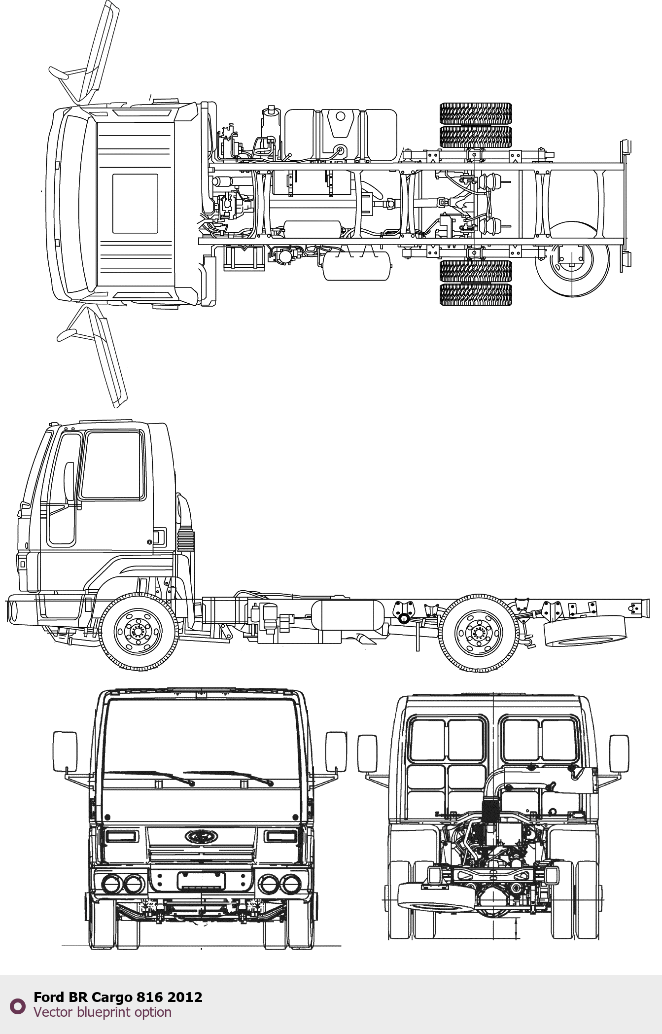 Raster blueprint of the 2012 Ford BR Cargo 816 Heavy Truck. This free downloadable image can be used for graphic projects, digital design, and 3D modeling. The file provides accurate exterior proportions of the vehicle. Model year: 2012. Body type: Heavy Truck.