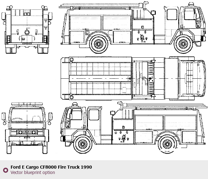 Raster blueprint of the 1990 Ford E Cargo CF8000 Fire Truck Heavy Truck. This free downloadable image can be used for graphic projects, digital design, and 3D modeling. The file provides accurate exterior proportions of the vehicle. Model year: 1990. Body type: Heavy Truck.