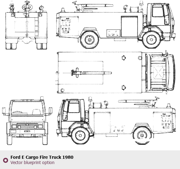 Raster blueprint of the 1980 Ford E Cargo Fire Truck Heavy Truck. This free downloadable image can be used for graphic projects, digital design, and 3D modeling. The file provides accurate exterior proportions of the vehicle. Model year: 1980. Body type: Heavy Truck.