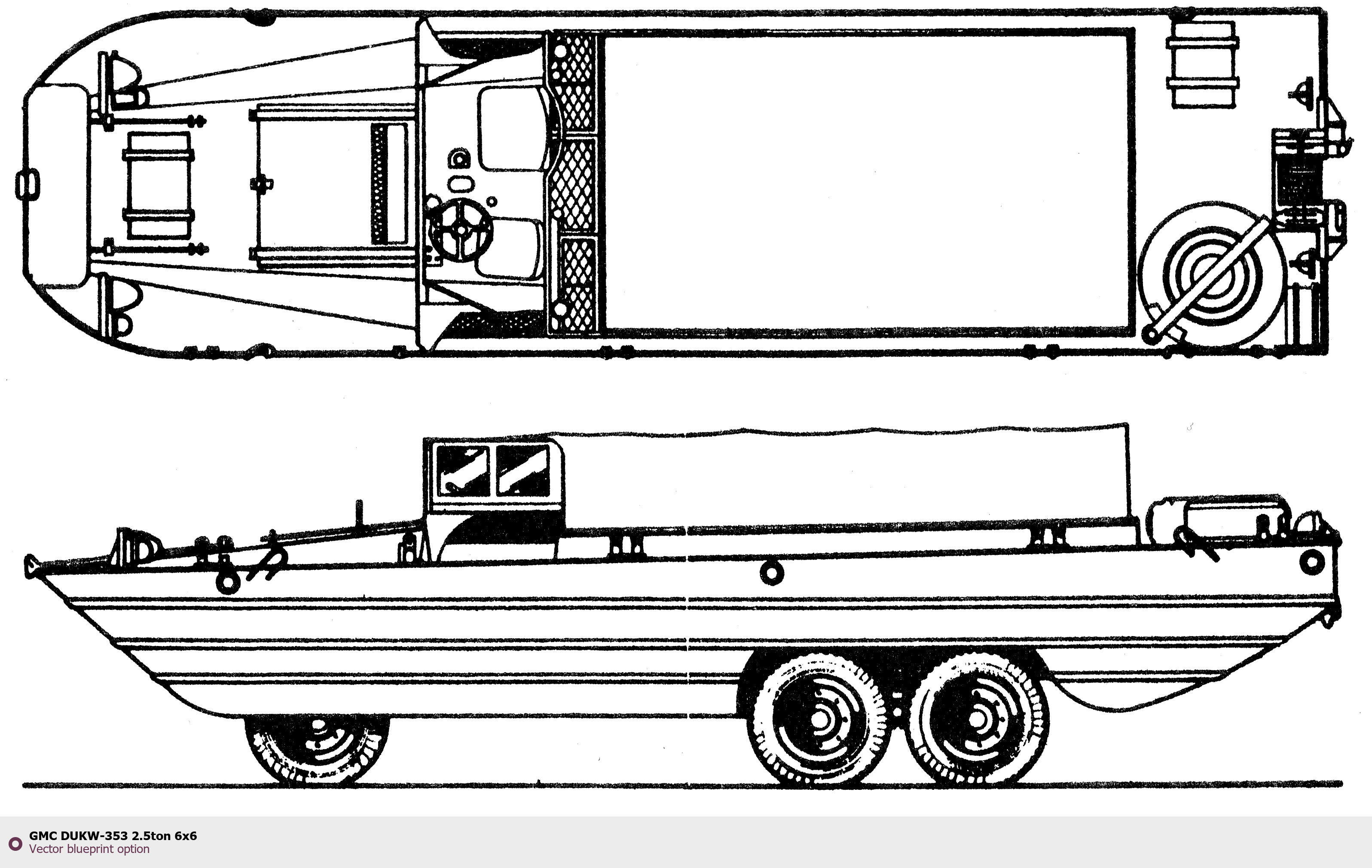 Raster blueprint of the GMC DUKW-353 2.5ton 6x6 Heavy Truck. This free downloadable image can be used for graphic projects, digital design, and 3D modeling. The file provides accurate exterior proportions of the vehicle. Body type: Heavy Truck.
