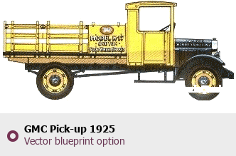 Raster blueprint of the 1925 GMC Pick-up Pickup Truck. This free downloadable image can be used for graphic projects, digital design, and 3D modeling. The file provides accurate exterior proportions of the vehicle. Model year: 1925. Body type: Pickup Truck.
