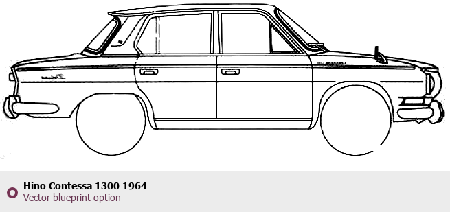 Raster blueprint of the 1964 Hino Contessa 1300 Heavy Truck. This free downloadable image can be used for graphic projects, digital design, and 3D modeling. The file provides accurate exterior proportions of the vehicle. Model year: 1964. Body type: Heavy Truck.
