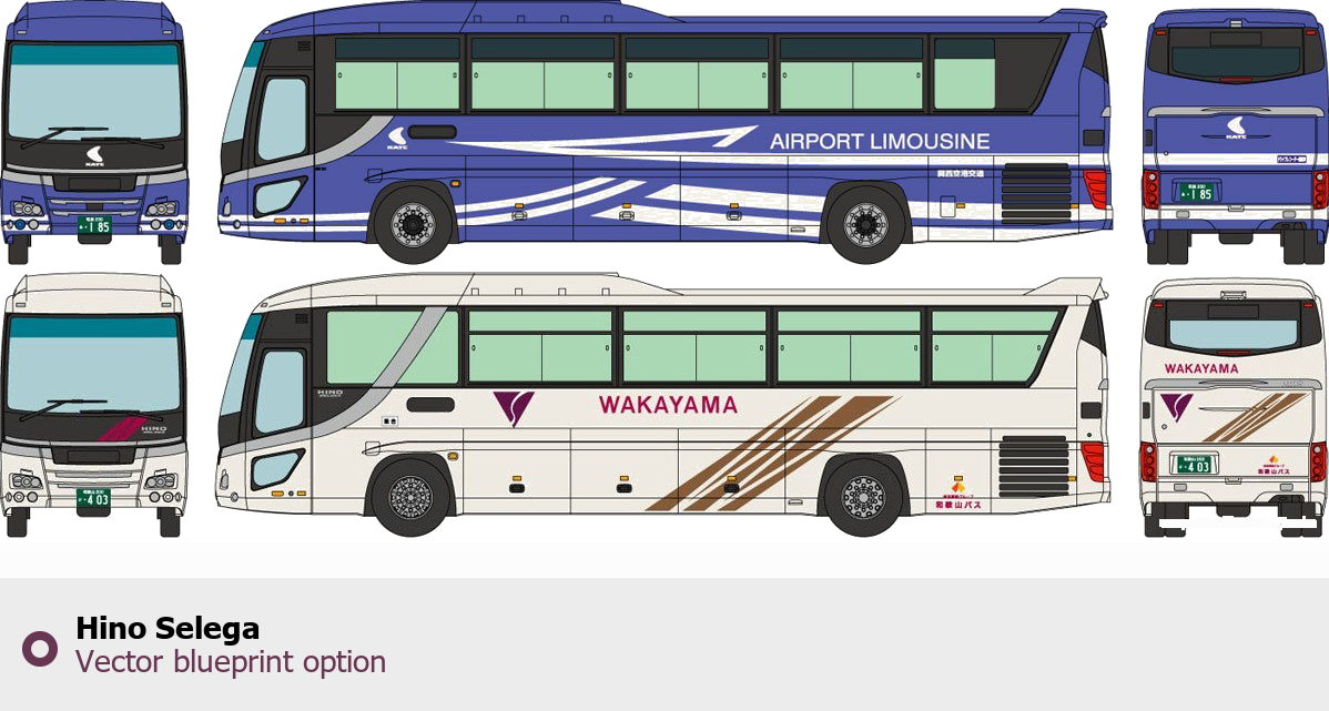 Raster blueprint of the Hino Selega Bus. This free downloadable image can be used for graphic projects, digital design, and 3D modeling. The file provides accurate exterior proportions of the vehicle. Body type: Bus.