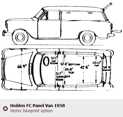 Raster blueprint of the 1958 Holden FC Panel Van Van. This free downloadable image can be used for graphic projects, digital design, and 3D modeling. The file provides accurate exterior proportions of the vehicle. Model year: 1958. Body type: Van.