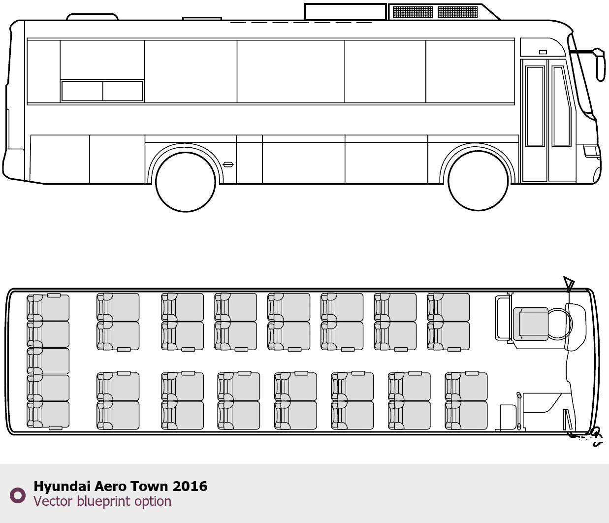 Raster blueprint of the 2016 Hyundai Aero Town Bus. This free downloadable image can be used for graphic projects, digital design, and 3D modeling. The file provides accurate exterior proportions of the vehicle. Model year: 2016. Body type: Bus.
