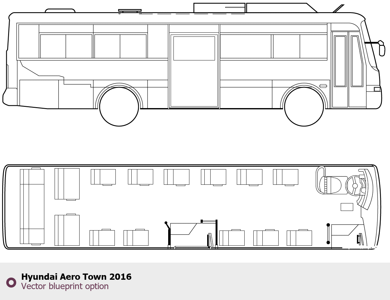 Raster blueprint of the 2016 Hyundai Aero Town Bus. This free downloadable image can be used for graphic projects, digital design, and 3D modeling. The file provides accurate exterior proportions of the vehicle. Model year: 2016. Body type: Bus.
