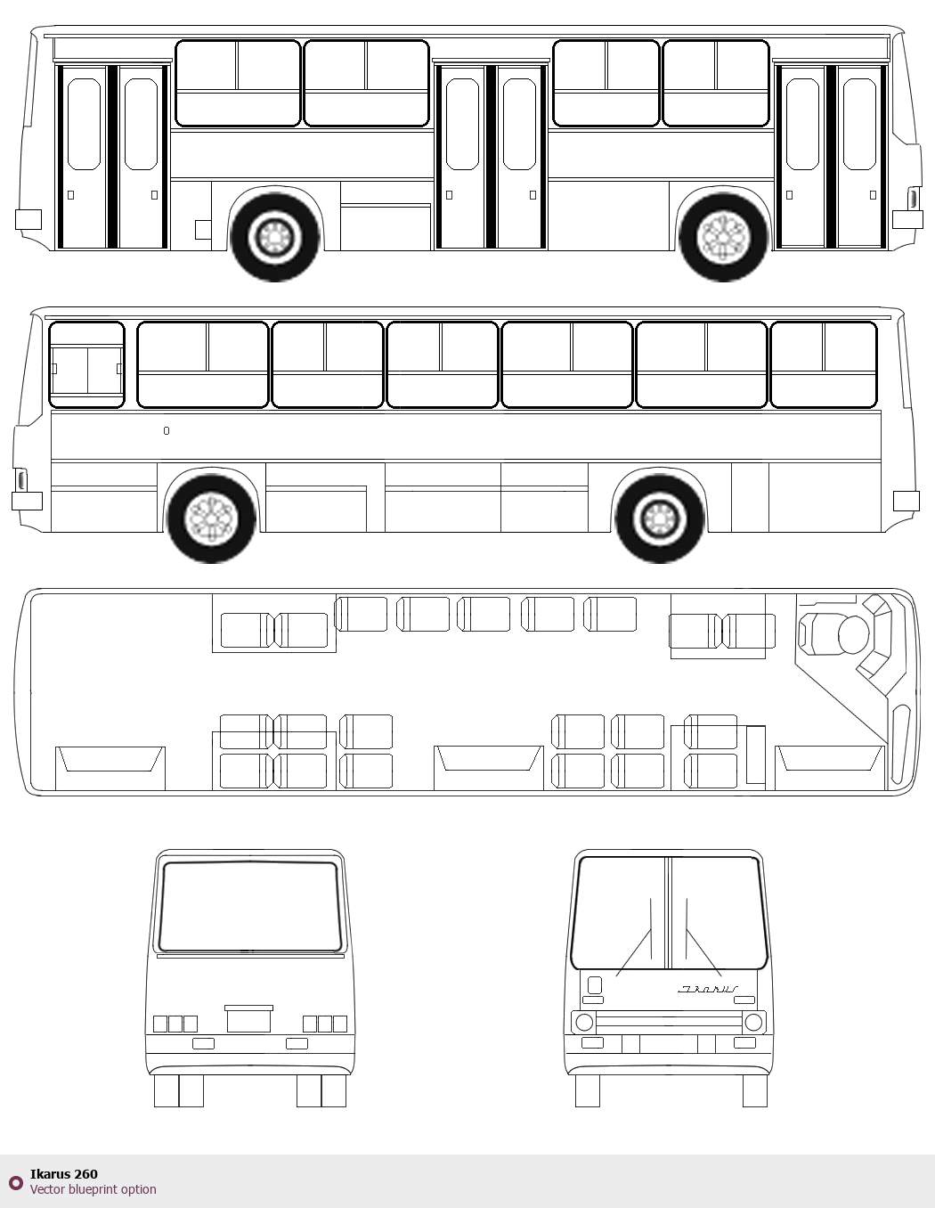 Raster blueprint of the Ikarus 260 Bus. This free downloadable image can be used for graphic projects, digital design, and 3D modeling. The file provides accurate exterior proportions of the vehicle. Body type: Bus.