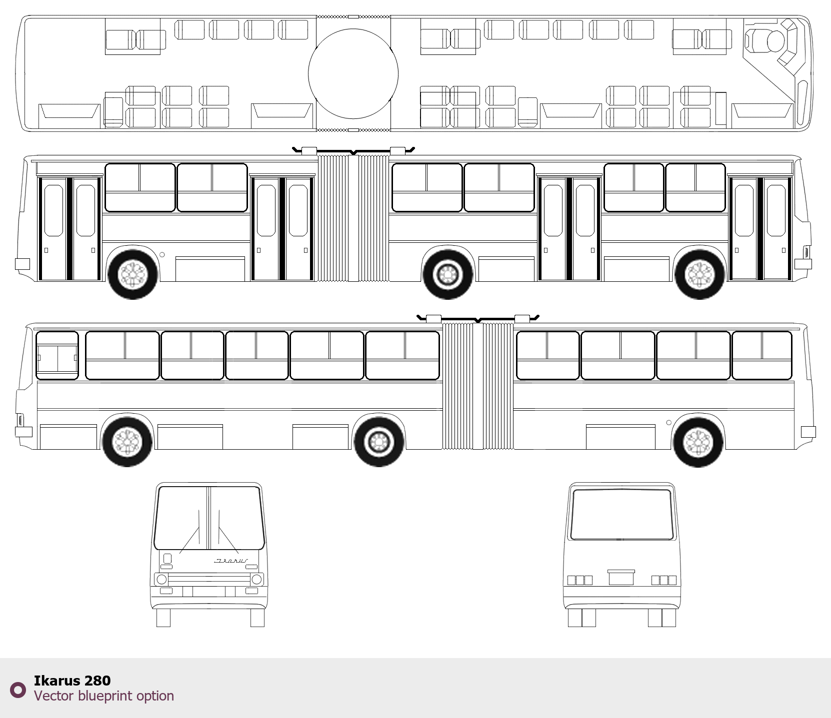 Raster blueprint of the Ikarus 280 Bus. This free downloadable image can be used for graphic projects, digital design, and 3D modeling. The file provides accurate exterior proportions of the vehicle. Body type: Bus.