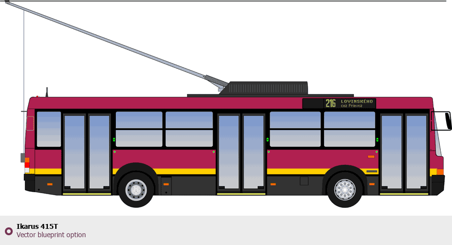 Raster blueprint of the Ikarus 415T Bus. This free downloadable image can be used for graphic projects, digital design, and 3D modeling. The file provides accurate exterior proportions of the vehicle. Body type: Bus.