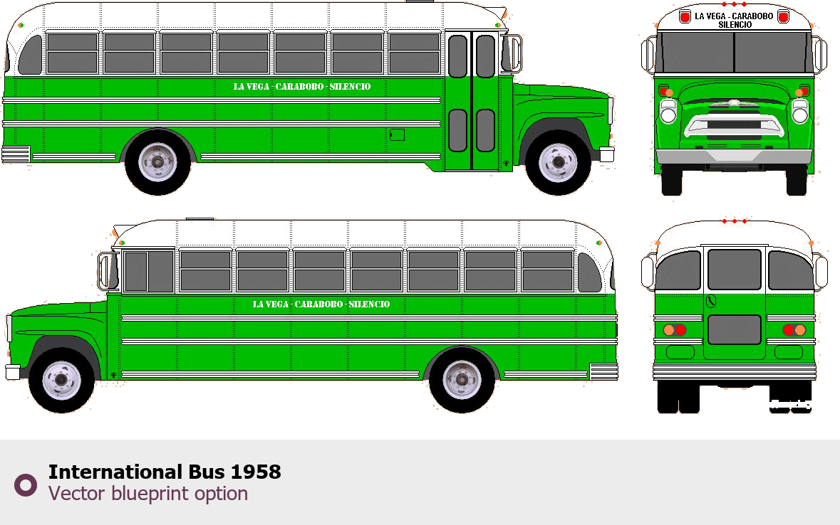 Raster blueprint of the 1958 International Bus Bus. This free downloadable image can be used for graphic projects, digital design, and 3D modeling. The file provides accurate exterior proportions of the vehicle. Model year: 1958. Body type: Bus.