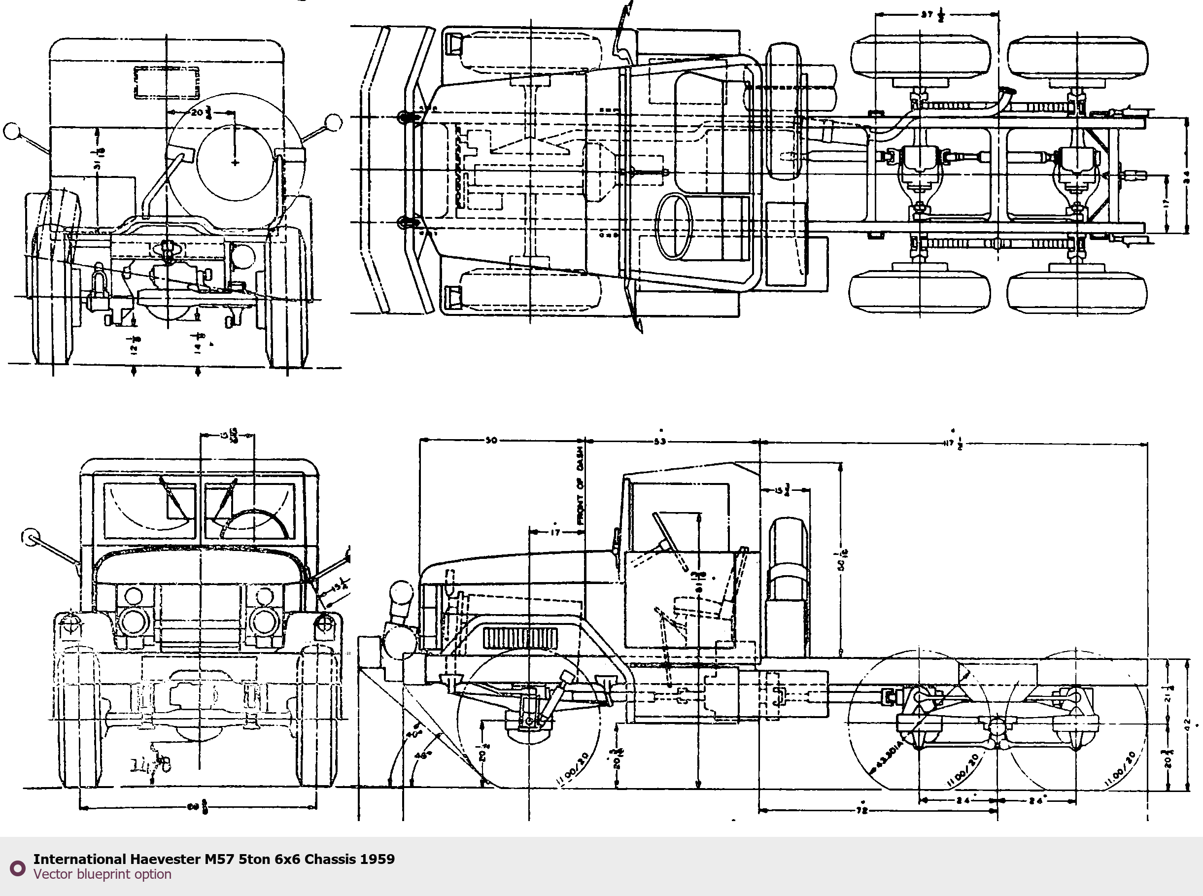 Raster blueprint of the 1959 International Haevester M57 5ton 6x6 Chassis Heavy Truck. This free downloadable image can be used for graphic projects, digital design, and 3D modeling. The file provides accurate exterior proportions of the vehicle. Model year: 1959. Body type: Heavy Truck.