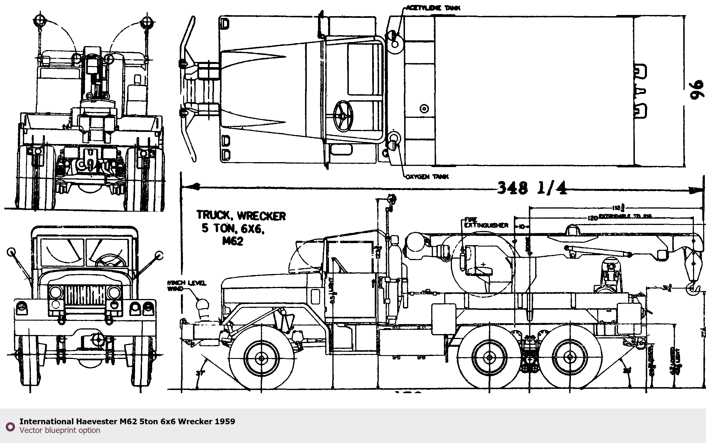 Raster blueprint of the 1959 International Haevester M62 5ton 6x6 Wrecker Heavy Truck. This free downloadable image can be used for graphic projects, digital design, and 3D modeling. The file provides accurate exterior proportions of the vehicle. Model year: 1959. Body type: Heavy Truck.