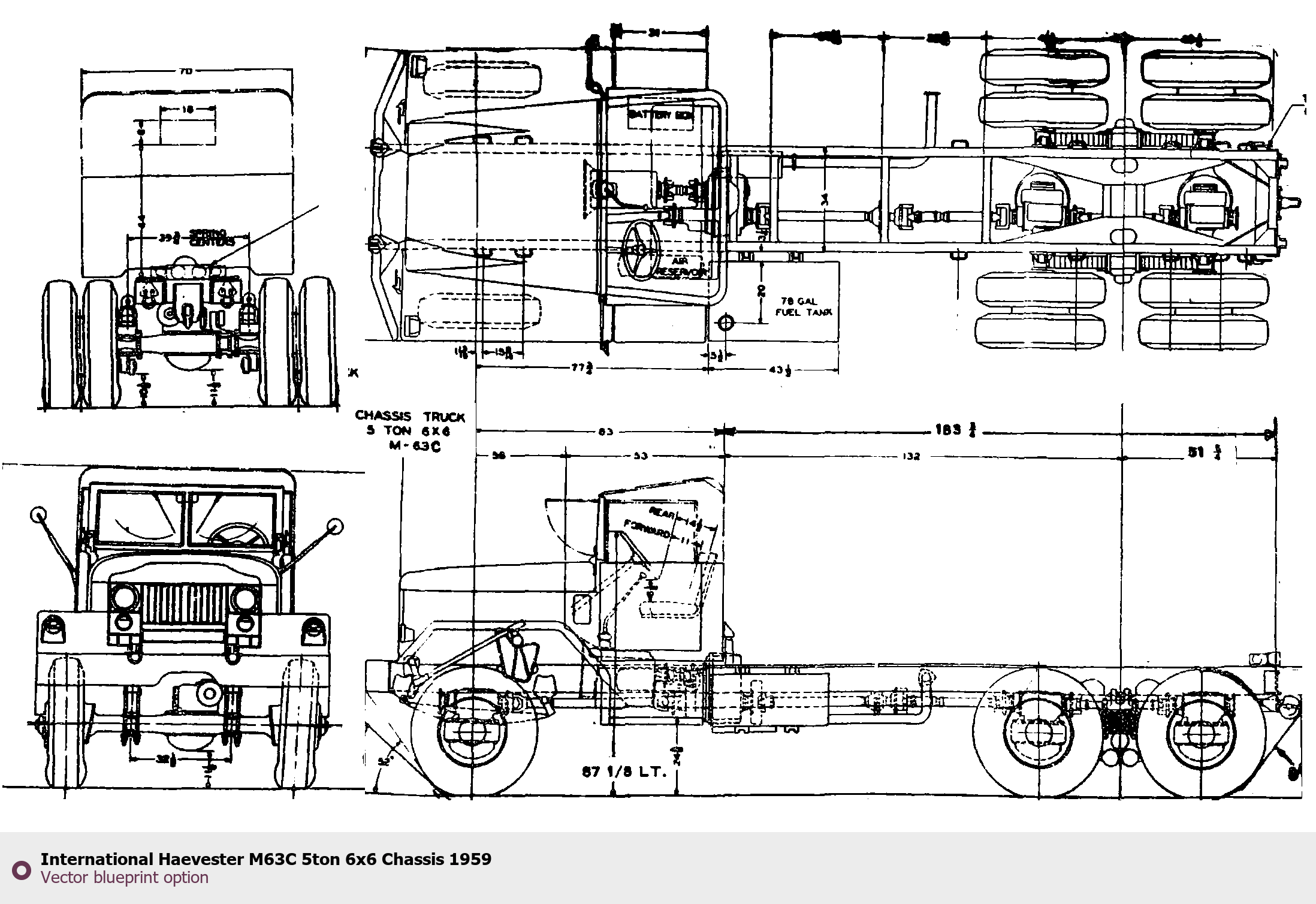 Raster blueprint of the 1959 International Haevester M63C 5ton 6x6 Chassis Heavy Truck. This free downloadable image can be used for graphic projects, digital design, and 3D modeling. The file provides accurate exterior proportions of the vehicle. Model year: 1959. Body type: Heavy Truck.