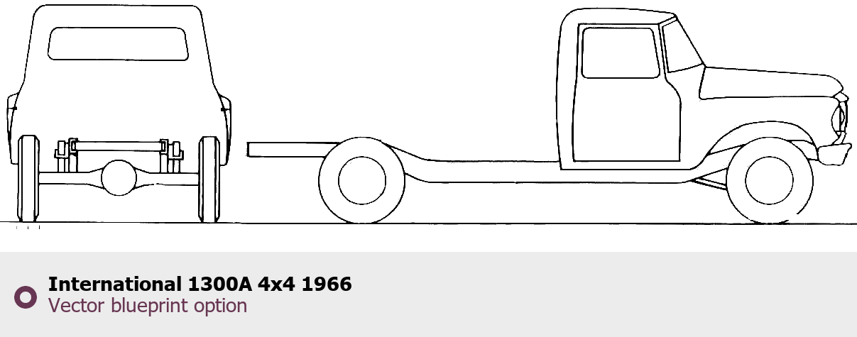 Raster blueprint of the 1966 International 1300A 4x4 Heavy Truck. This free downloadable image can be used for graphic projects, digital design, and 3D modeling. The file provides accurate exterior proportions of the vehicle. Model year: 1966. Body type: Heavy Truck.